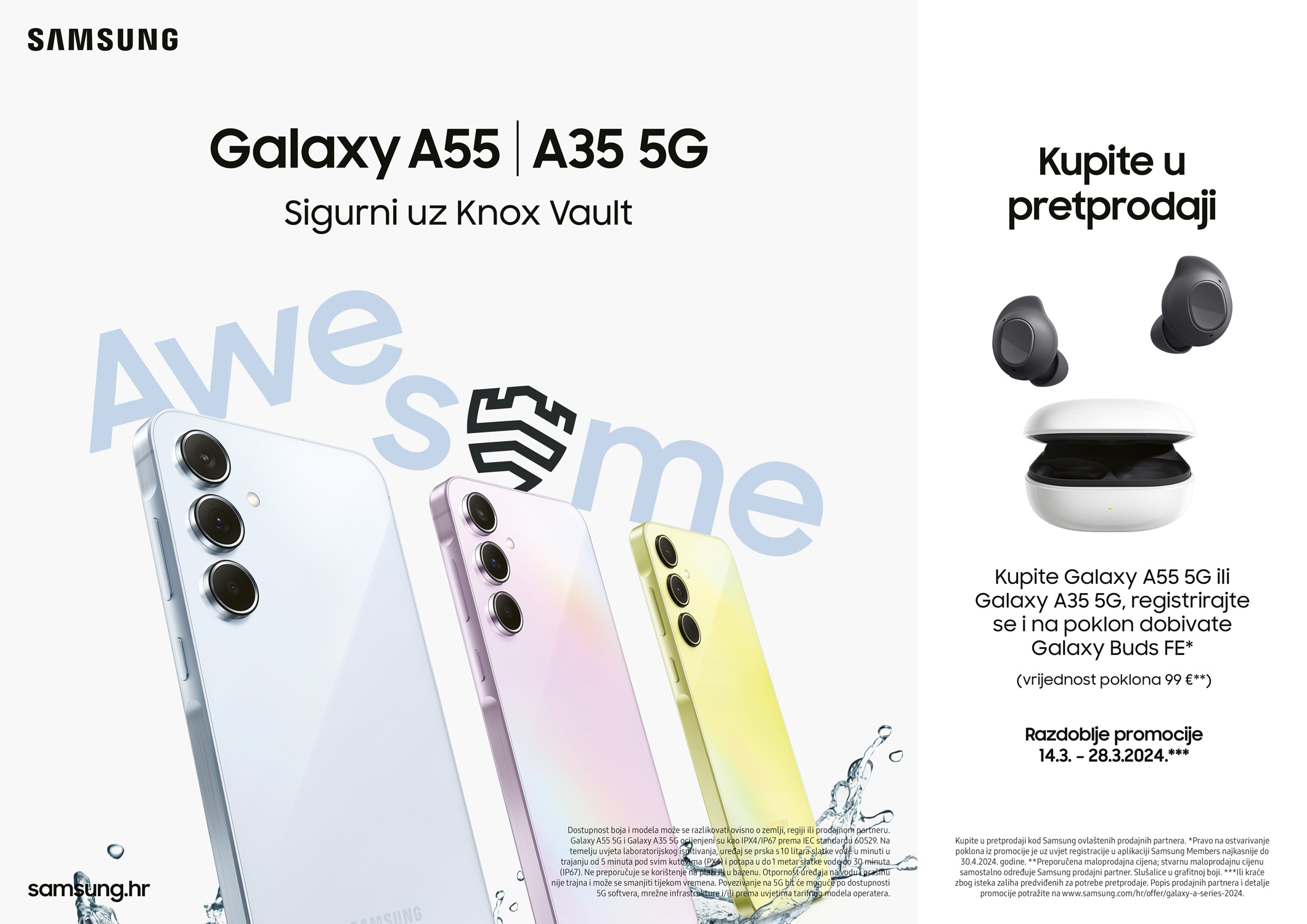 Ako kupite u pretprodaji Galaxy A35 5G (6+128GB, 8+256GB, od 379 eura ili Galaxy A55 5G (8+128GB, 8+256GB, od 479 eura) od 14.3. do 28.3.2024. na poklon dobivate sjajne Galaxy Buds FE slušalice u grafitnoj boji, vrijedne 99 €!