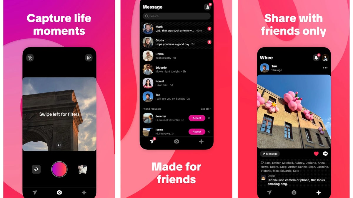Jedna od glavnih značajki Whee-a je tražilo za fotografije koje omogućava korisnicima da brzo i jednostavno snimaju i dijele slike. Uz to, aplikacija uključuje popis prijatelja za slanje poruka, što olakšava privatne razgovore i dijeljenje trenutaka unutar zatvorenog kruga prijatelja. Feed unutar aplikacije omogućava pregledavanje sadržaja koji su podijelili vaši najbliži prijatelji, stvarajući tako osjećaj zajednice i bliskosti.