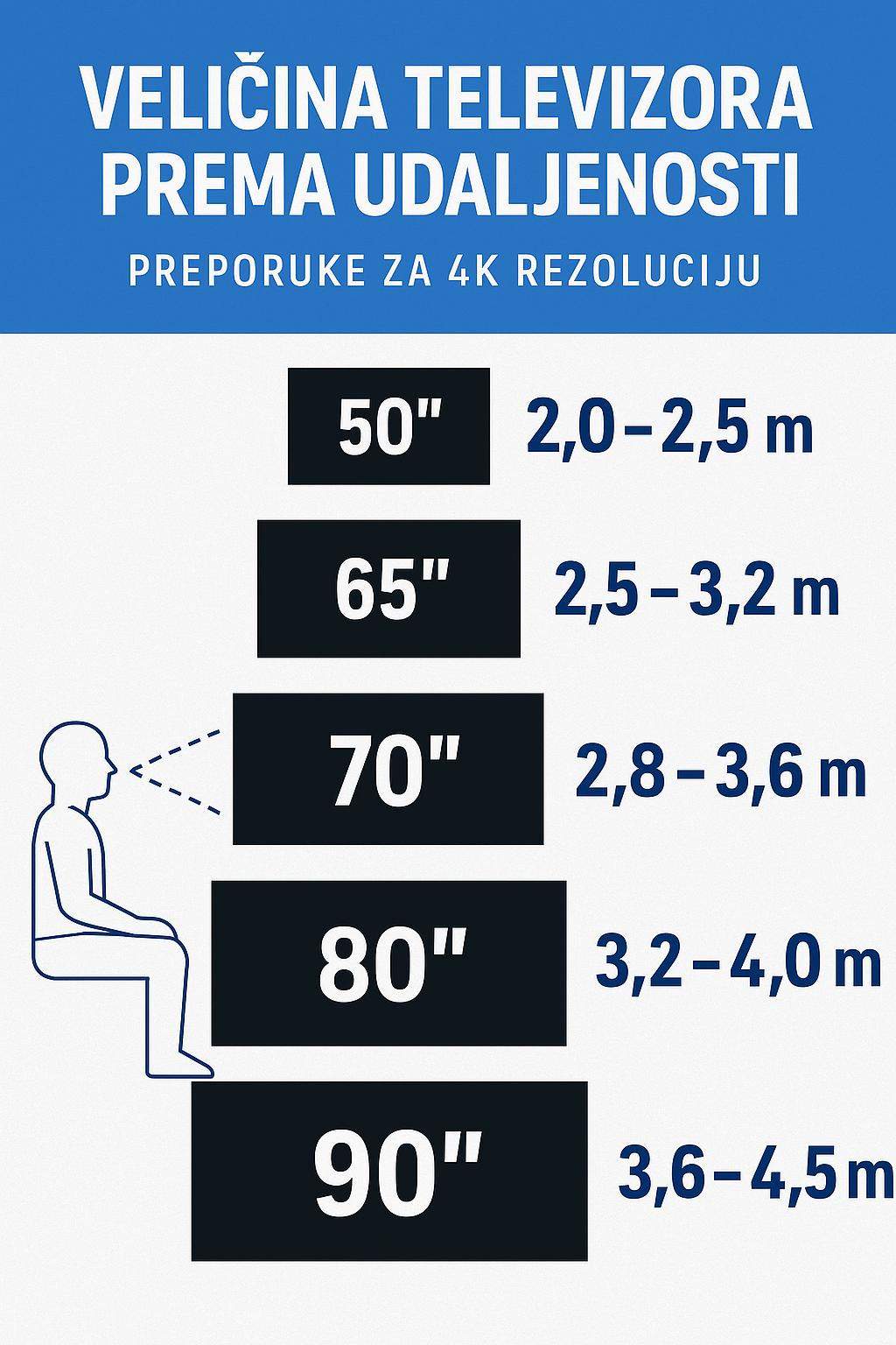 Za 4K (UHD) ekrane idealne su manje udaljenosti nego što je vrijedilo u Full HD eri. Uzmite ovo kao orijentir, a ako ste između dvije veličine – birajte veću.